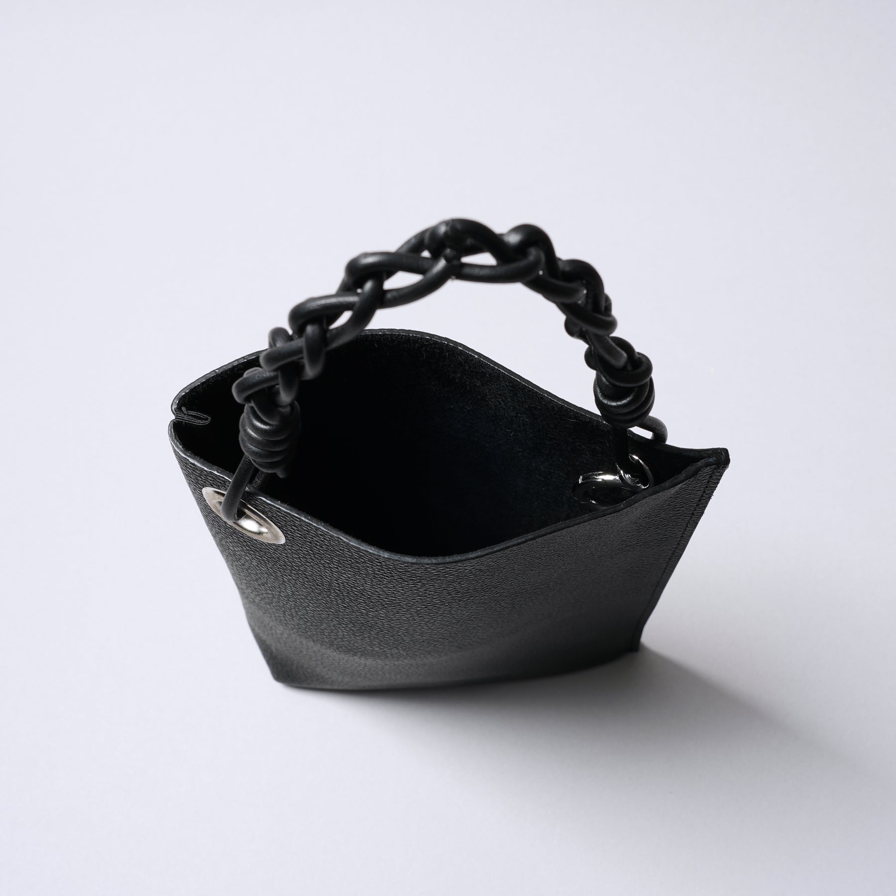 ■The handle section, woven into a chain-like pattern with leather cord, is the iconic feature of this mini bag.