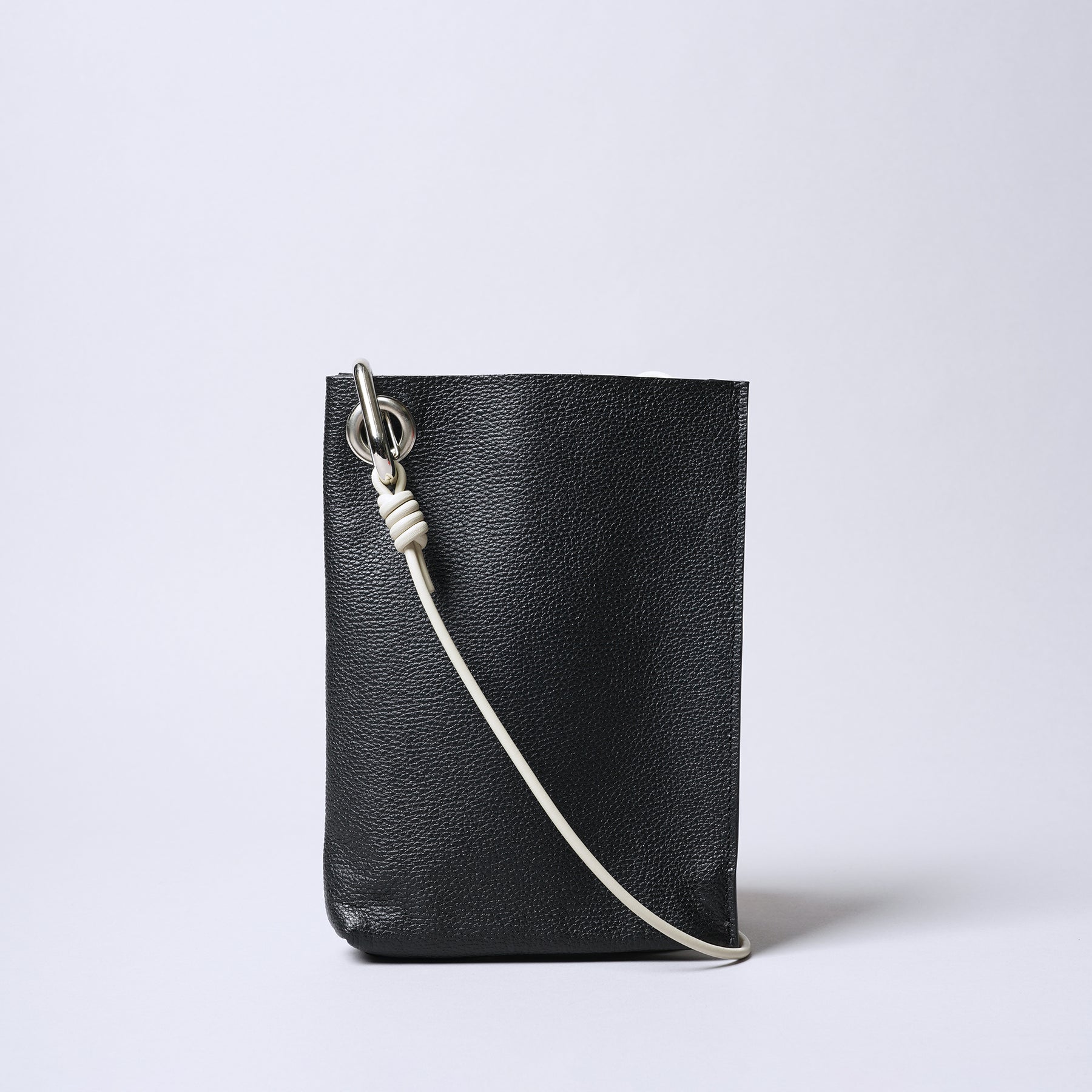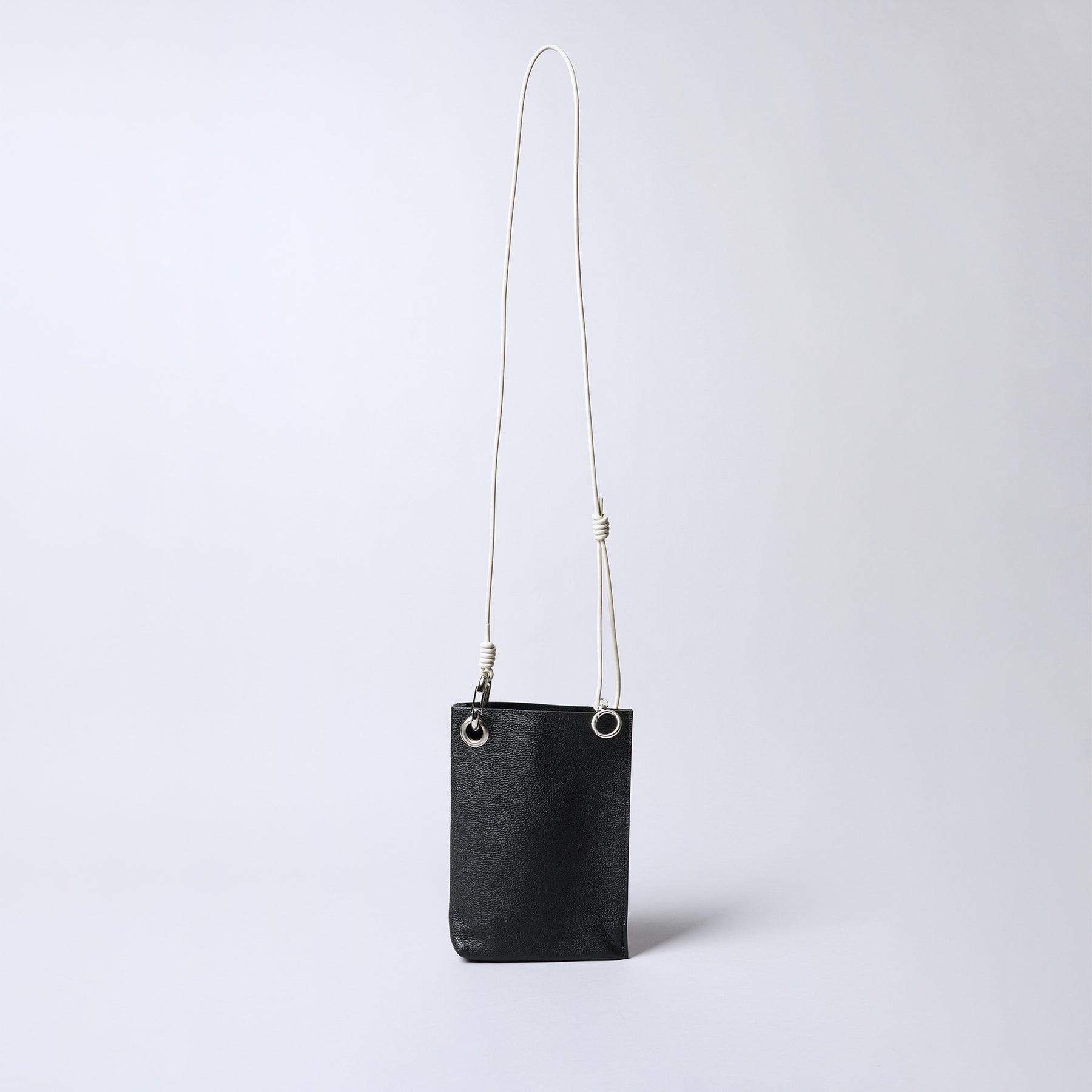 ■A minimalist mini shoulder bag featuring industrial metal hardware, with one side featuring gussets and the other side without, creating an asymmetrical shape that appears simple yet is packed with thoughtful details