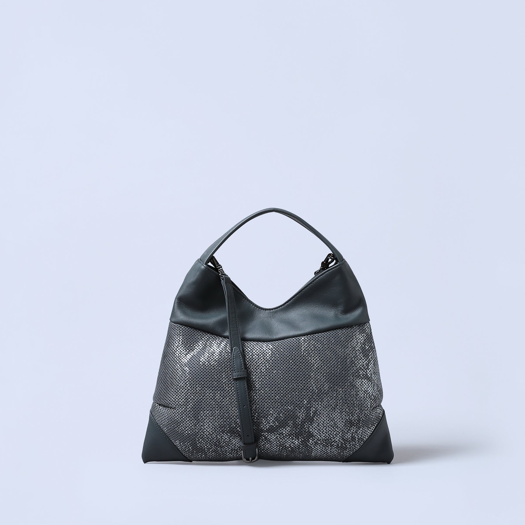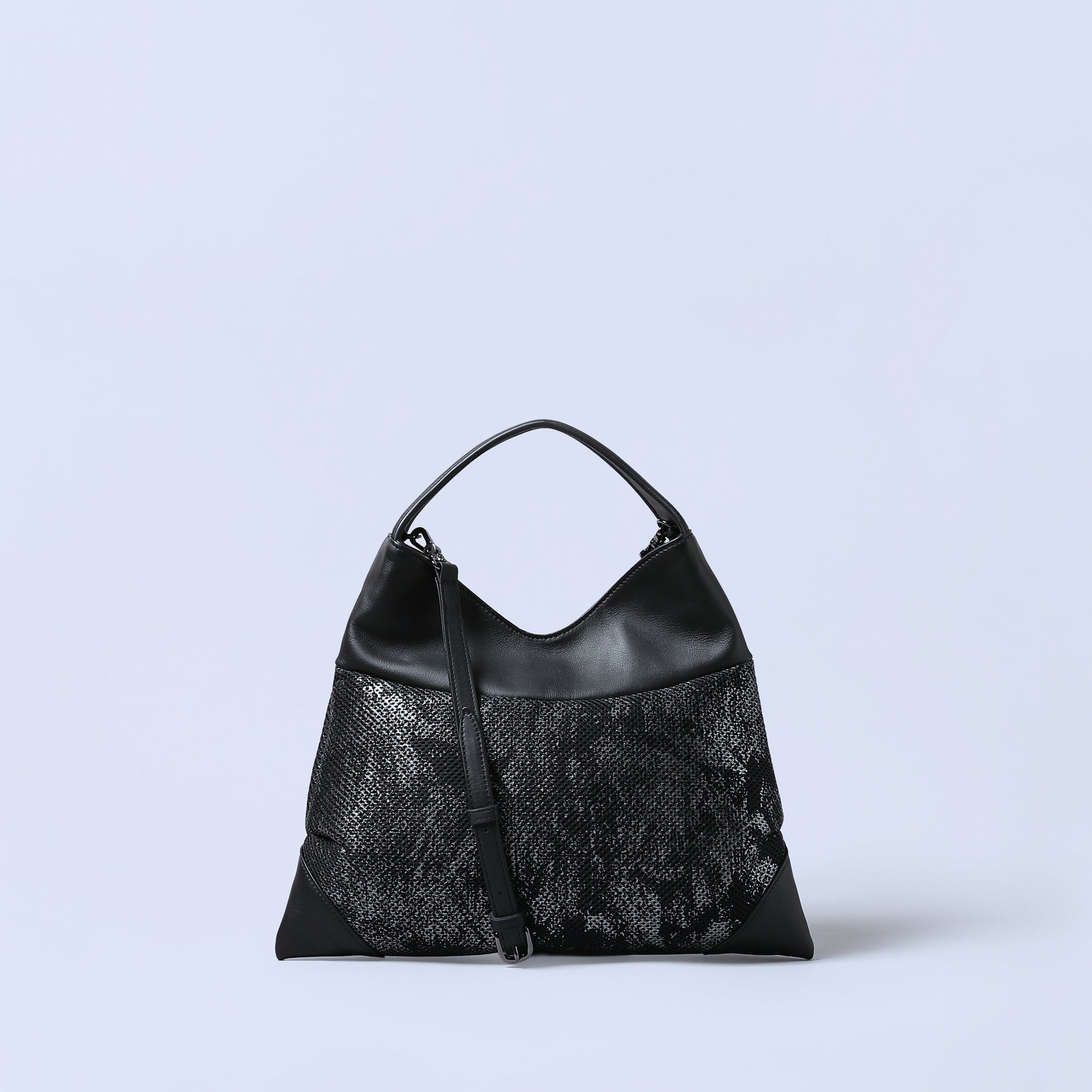 ファッションと親和性の高い軽量異素材コレクション。アートなメタリックのアブストラクト柄がモードな雰囲気。軽いラッセル生地とタッチ感の良いソフトな牛革を使用。ハンドルが心地良く手になじみ辛口モードを和らげる。実用性とファッション性を兼ね備えたバッグは、大人のデイリーパートナーにふさわしい。