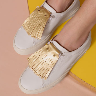 お手持ちの靴に取り付ければ簡単にカスタムできるシューキルト。紐のついている靴ならスニーカでも革靴でもOKです。シンプルな形でどんな靴とも相性が良くコーディネイトしやすいので、履き慣れた靴をおしゃれに着せ替えしてみてはいかがでしょうか。※使用しているメタリックレザーは、メタリック加工を施した後、タイコと呼ばれるドラム状の回転機械で空打ち(薬品や水を加えずに革のみ回転させる工程)しています。それにより革全体が柔らかくなり、表面には自然なシボが現れます。またところどころでメタリックが剥げることでダメージ加工のような風合いが生まれ、より表情豊かな仕上がりになります。使用を重ねるうちに摩擦やこすれによってメタリックが剥がれることがありますが、それも経年変化の一つとしてお楽しみください。