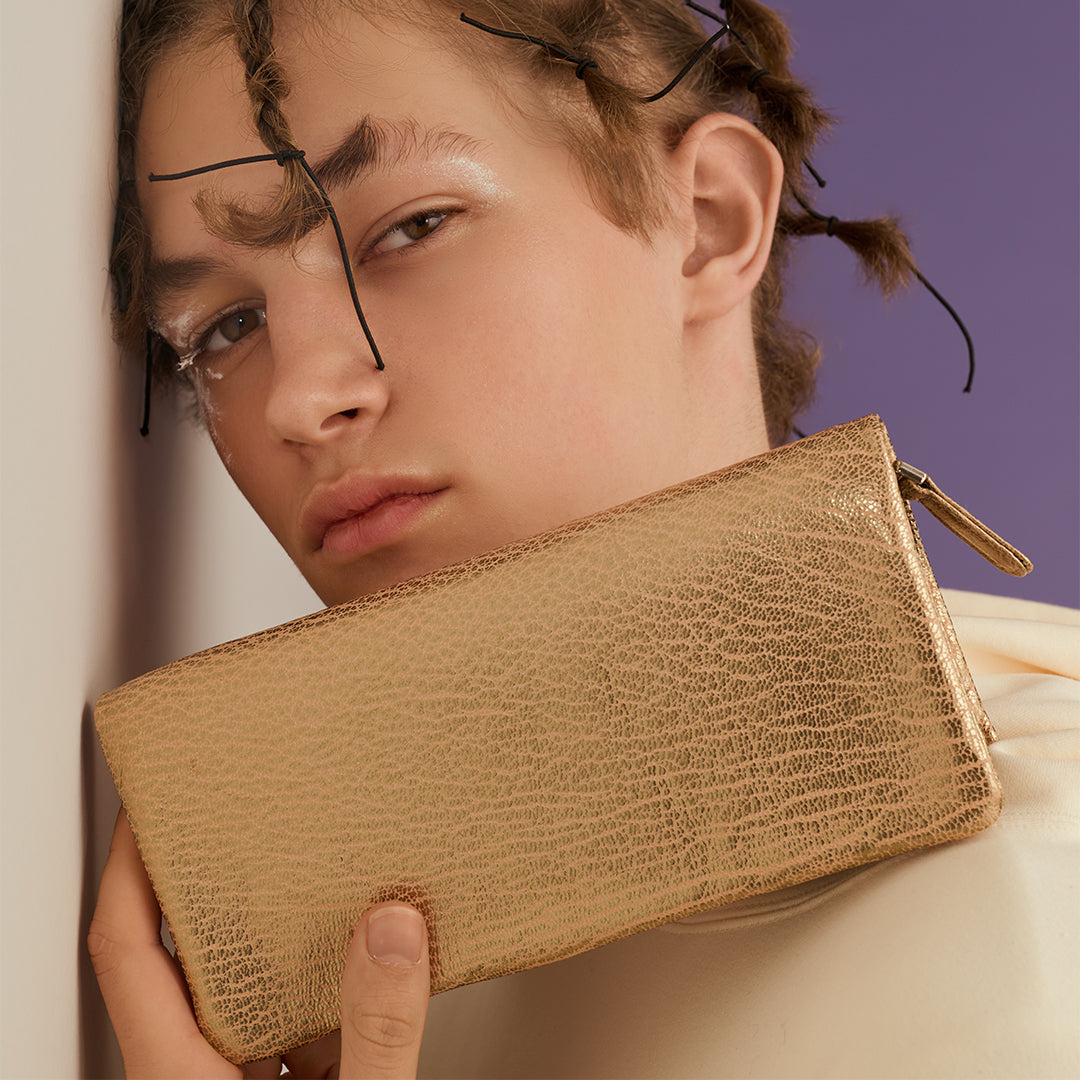 手元で輝く上品な風合いのゴートレザーのBOX小銭入れ付きラウンドファスナー長財布。ソフトな素材を最大限に生かすために外からはミシン目が見えないよう内縫いで縫製した職人の技術が凝縮した財布です。ゴートレザー特有のシボはキメ細やかで高級感があり、肌触りが柔らかくしなやかです。革らしい肌目とメタリックとのコントラストがきれいな財布です。