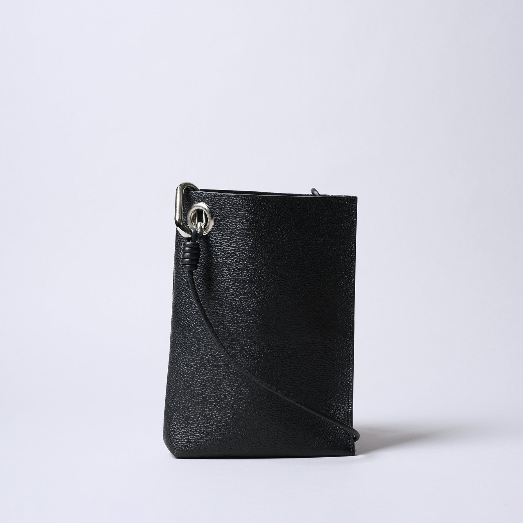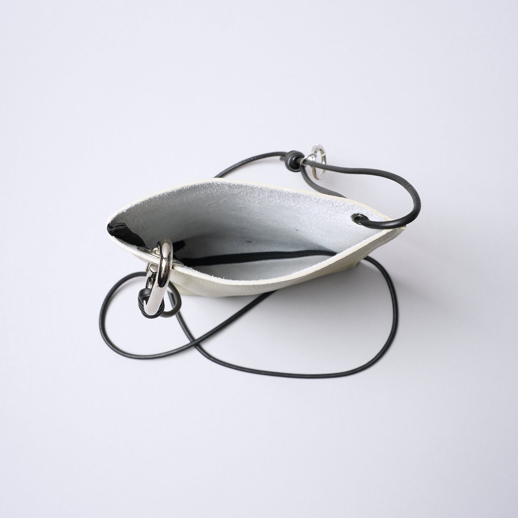 ■インダストリアルな金属パーツを使用し、片側はマチあり、もう一方はマチ無しの変則的など形など、一見シンプルな見え方ながら拘りの詰まったミニショルダーバッグ
