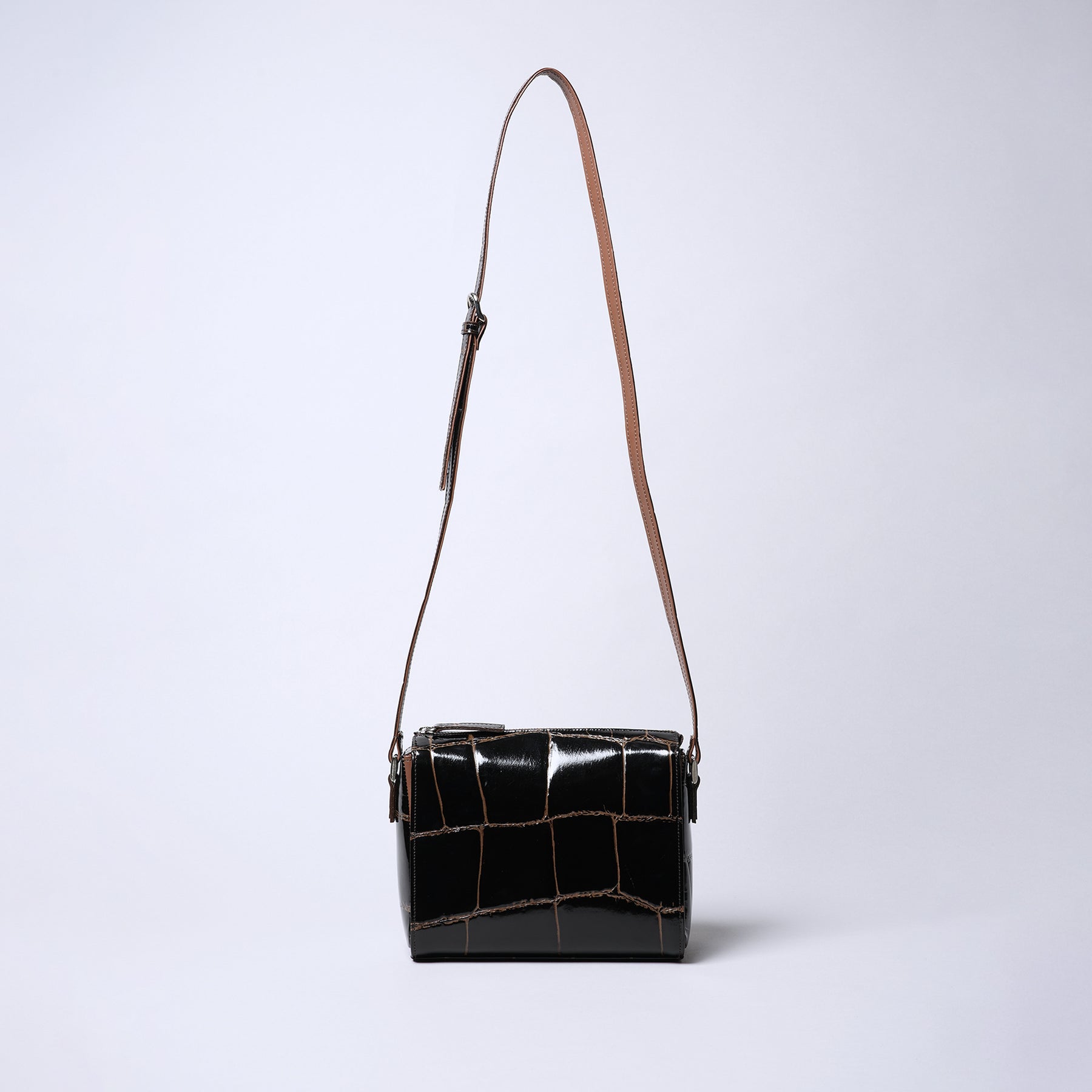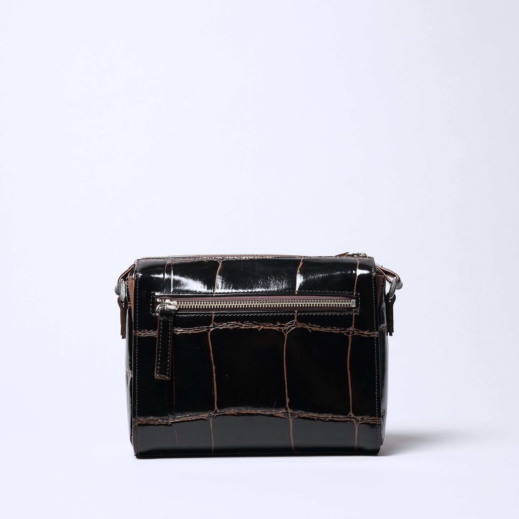 全体にラージクロコの型押し牛革を贅沢に使用したシリーズの筒形ショルダーバッグです。一見かっちりした印象ですが、カジュアルな装いにも合わせられ気軽に持てるバッグです。