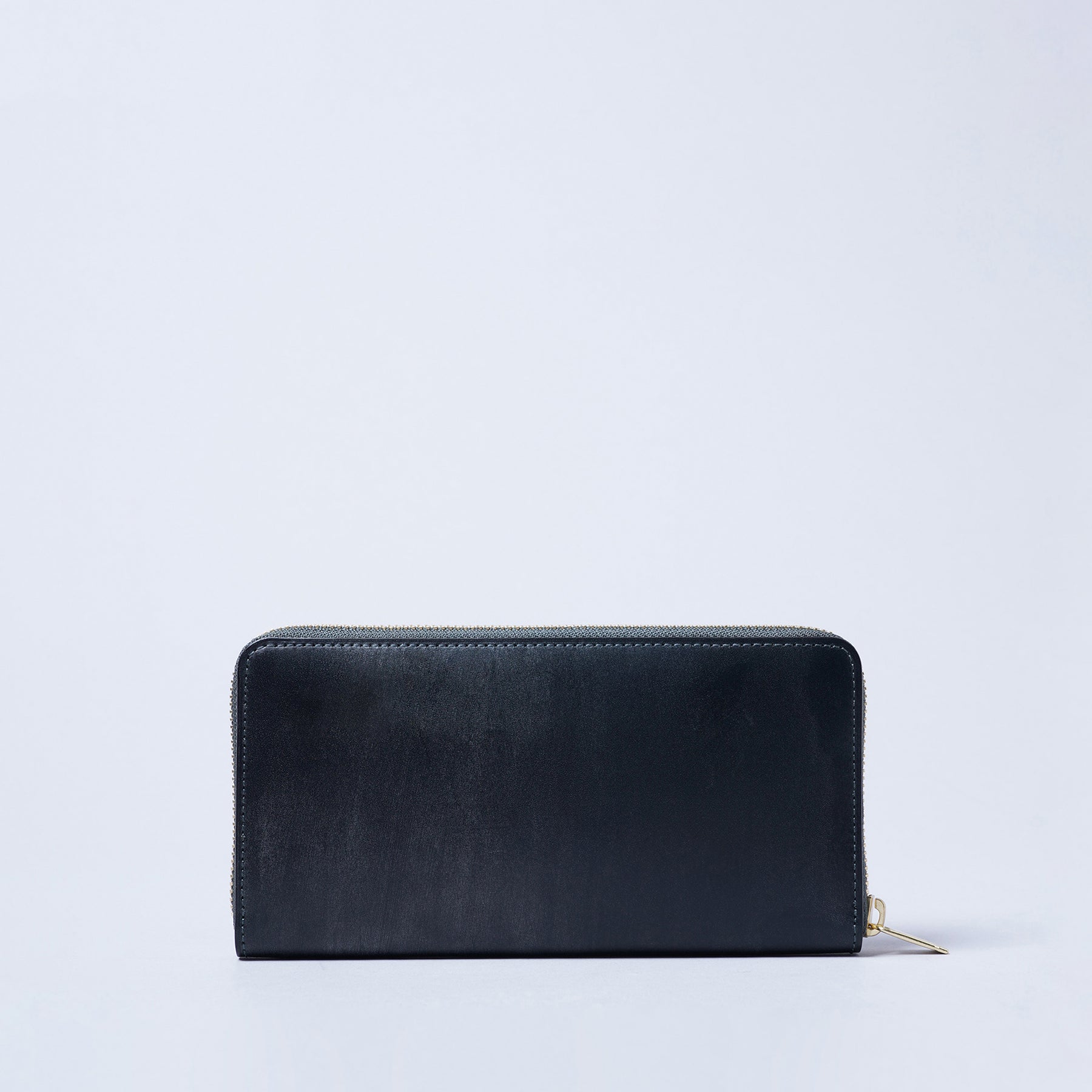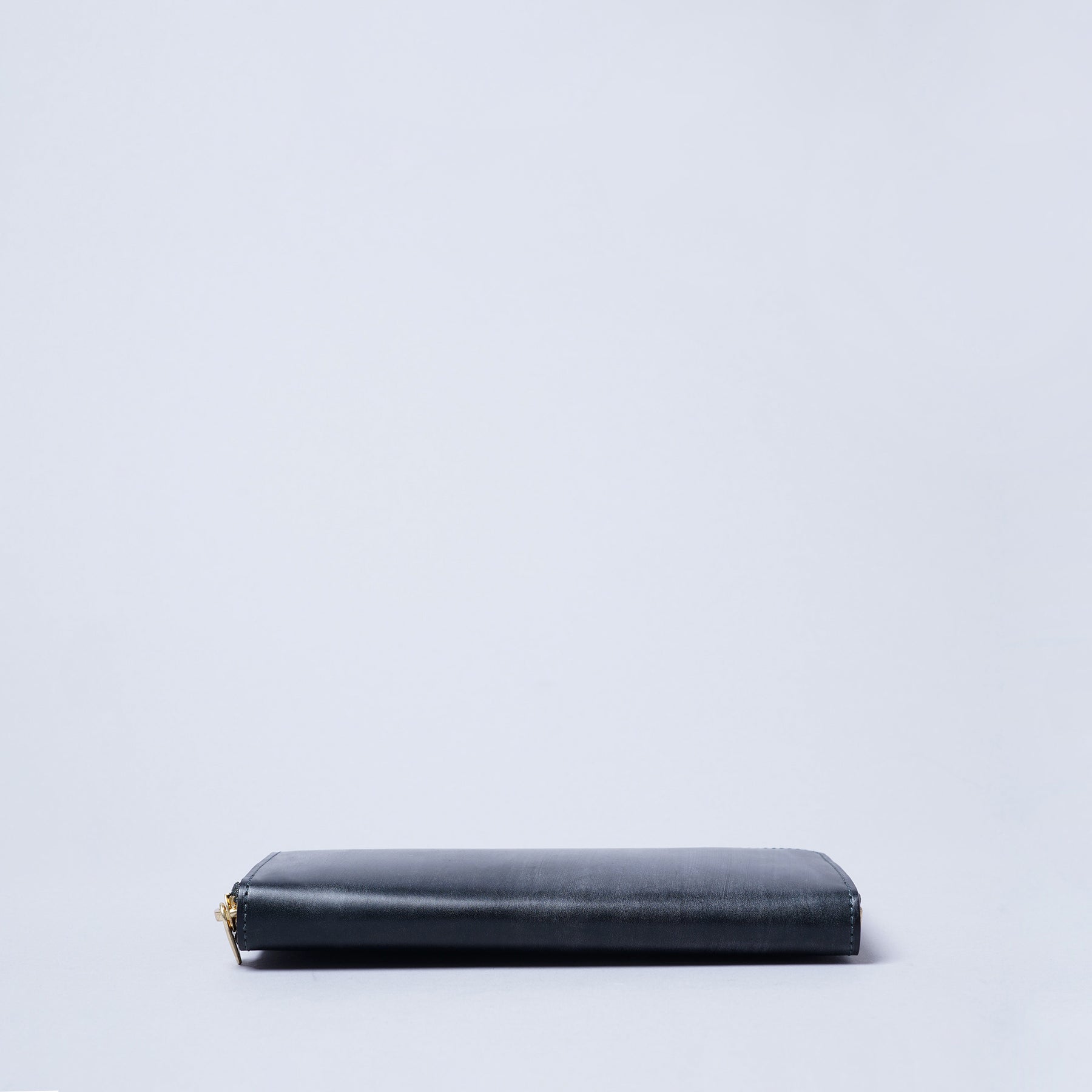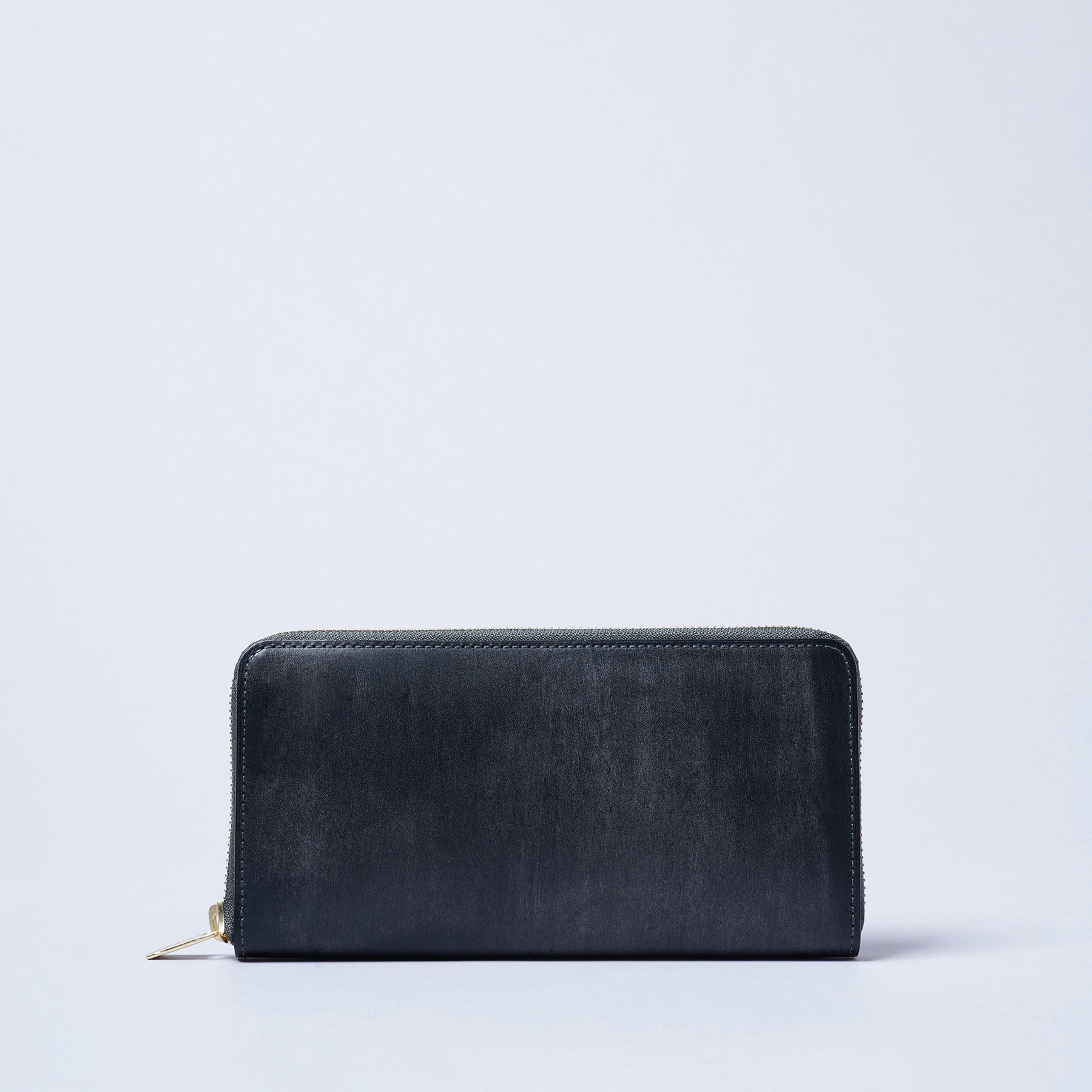 Bridle leather, developed in Britain for horse tack. Its appeal lies in the inherent beauty of the leather itself: a smooth, uniform grain surface that deepens with use, developing a rich patina and distinctive sheen. Crafted luxuriously from a single, uncut piece of bridle leather, this long wallet exudes an overwhelming presence layered with elegance, embodying a mature, sophisticated presence.