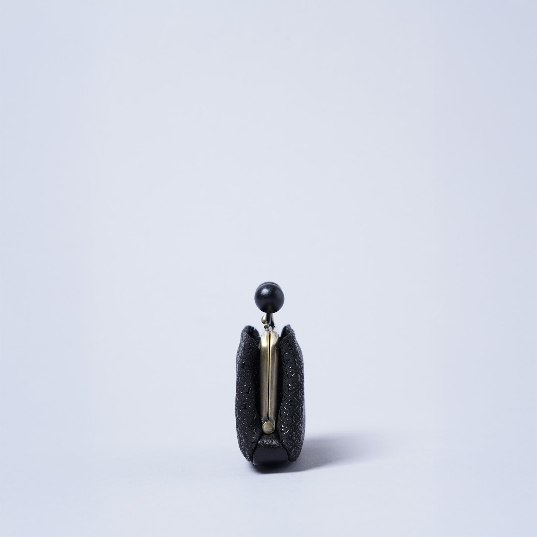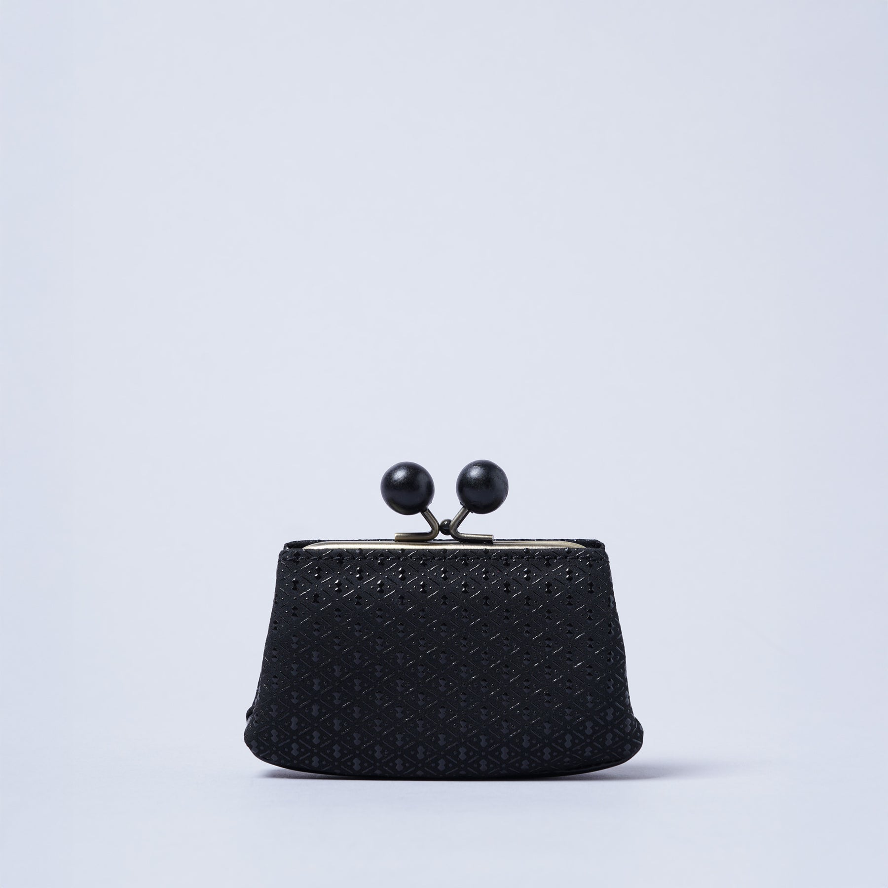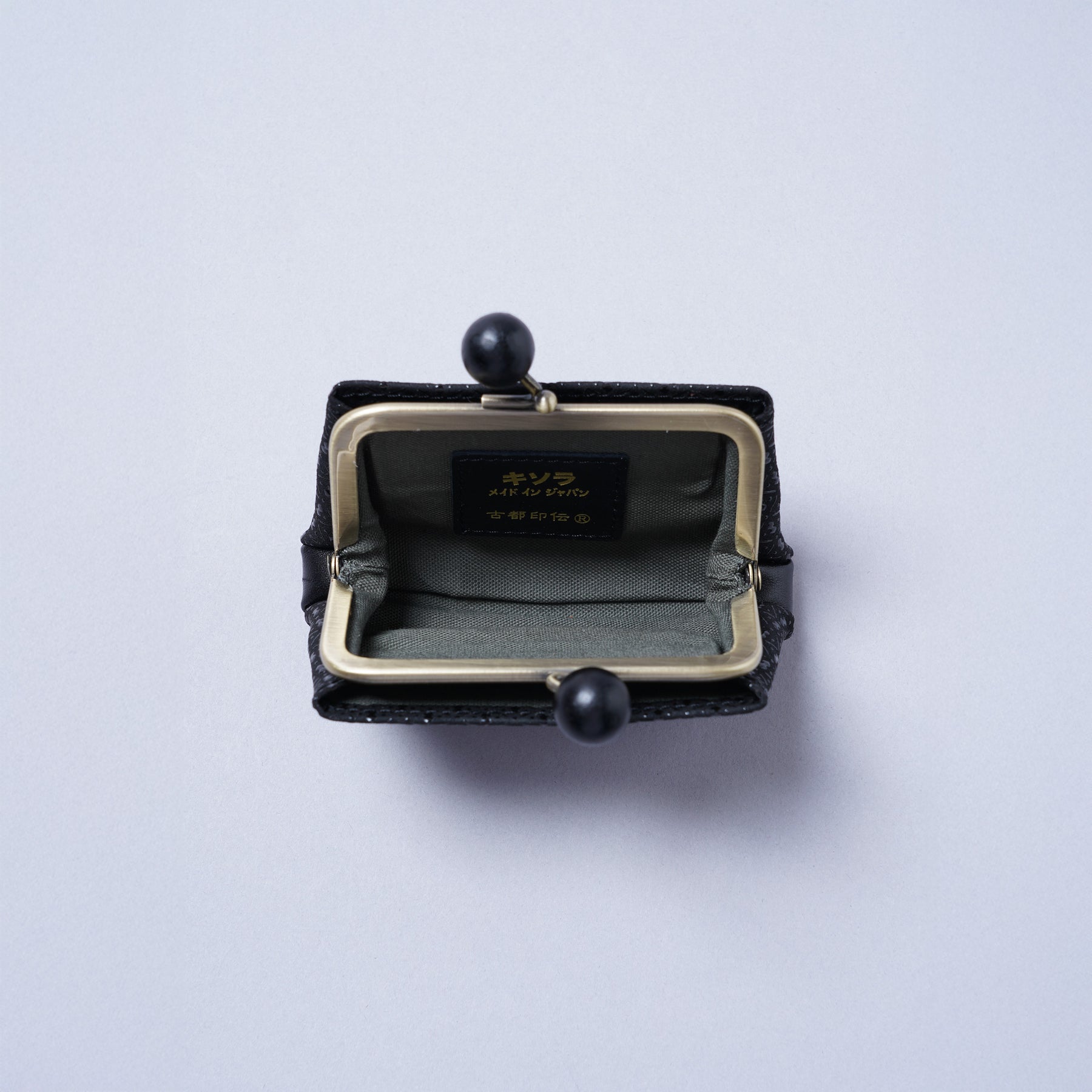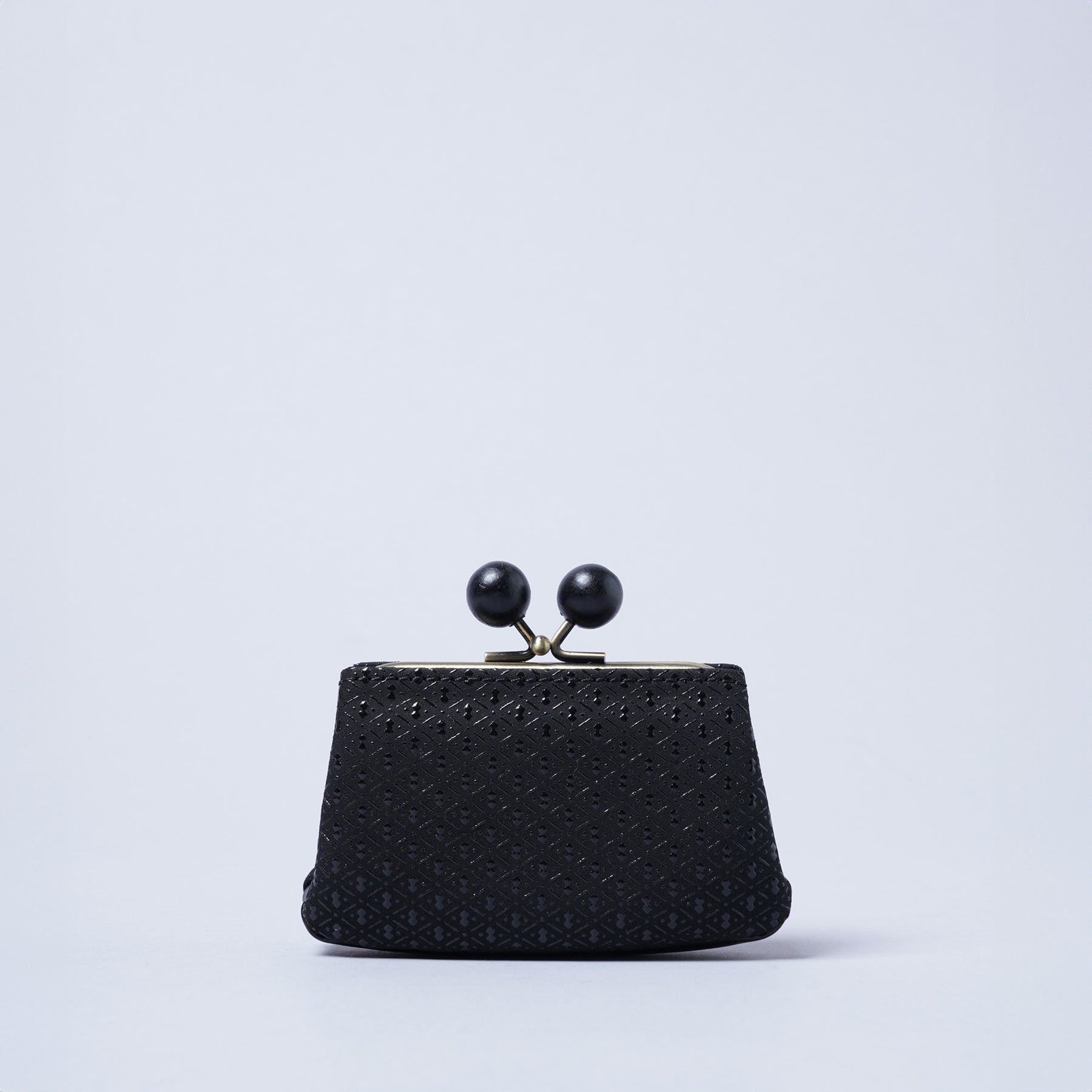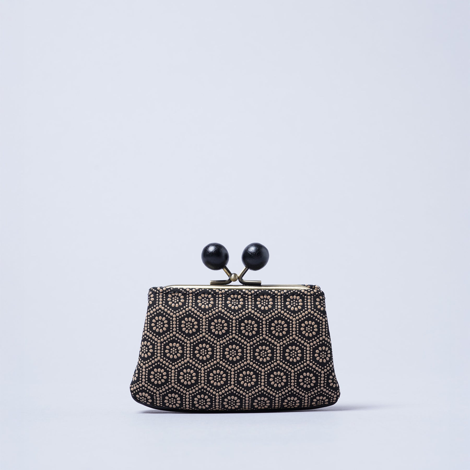 本シリーズでは木製で大きめのらっきょう玉と真鍮色の金具が上品なバランスで仕立てられたがま口を使用しています。らっきょう玉は大きいながらも軽いものを使用しているので全体の重みには影響しないのが嬉しいポイント。深い色味と木目仕様が和風をさらに演出したアクセントになっています。