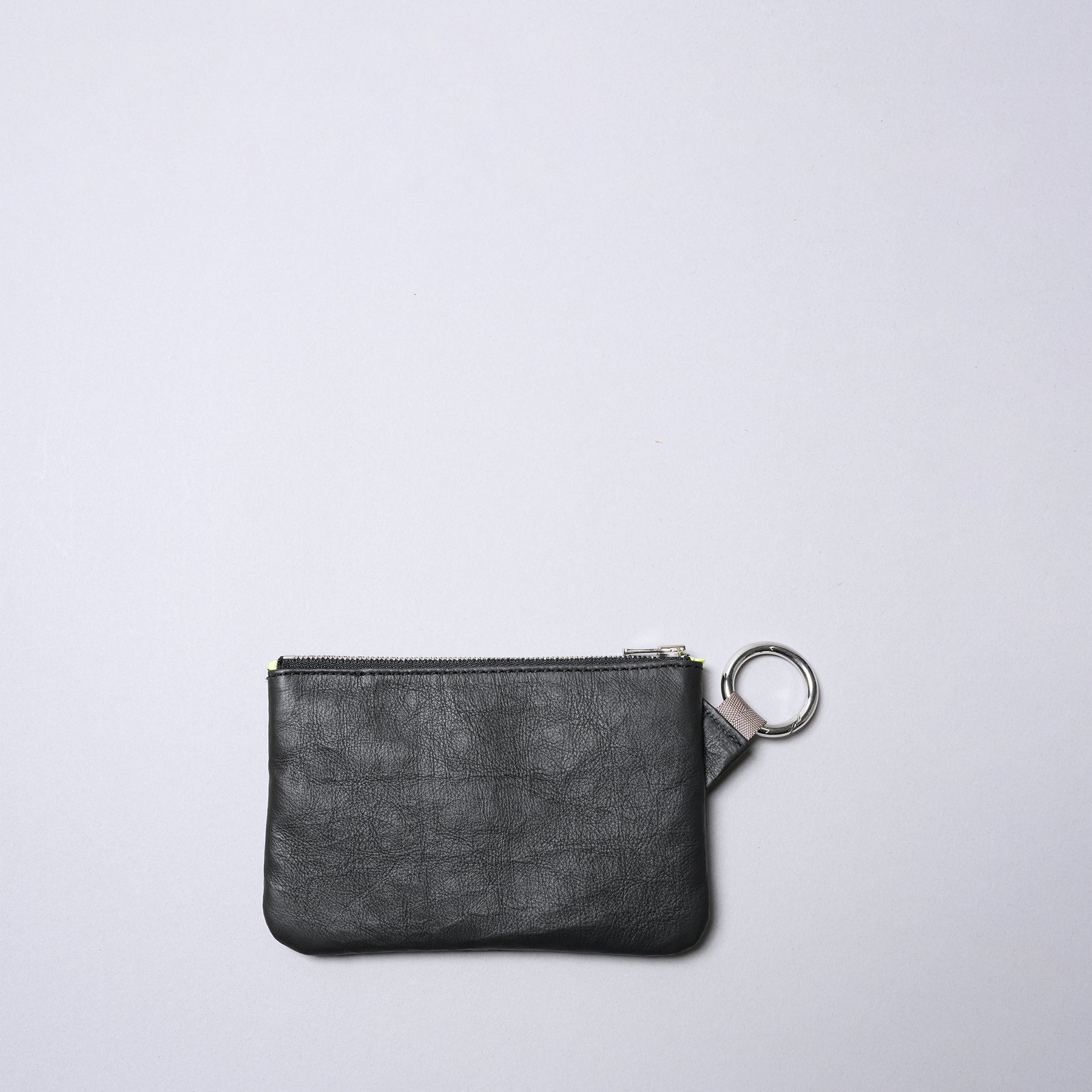 A pouch crafted from Dyneema® leather. The interior pocket utilizes Dyneema® Composite Fabric and CORDURA® fabric. The partially incorporated translucent white film material (Dyneema® Composite Fabric) is accented with fluorescent yellow piping tape that stands out against the monochrome palette, creating a pop finish that contrasts with the exterior's subdued look. Equipped with a ring clip, it can be used alone, attached to other bags, or worn using belt loops. Pairing it with the separately sold nylon strap or multi-cord allows for customization into a minimal-sized bag, further expanding its uses. Designed with wearability in mind, this item fully leverages the lightweight benefits of Dyneema® leather. Weight: 46g Inside: Side pockets x2, Card pockets x2 Examples: earbuds, tablet, cars, coins, bills etc.