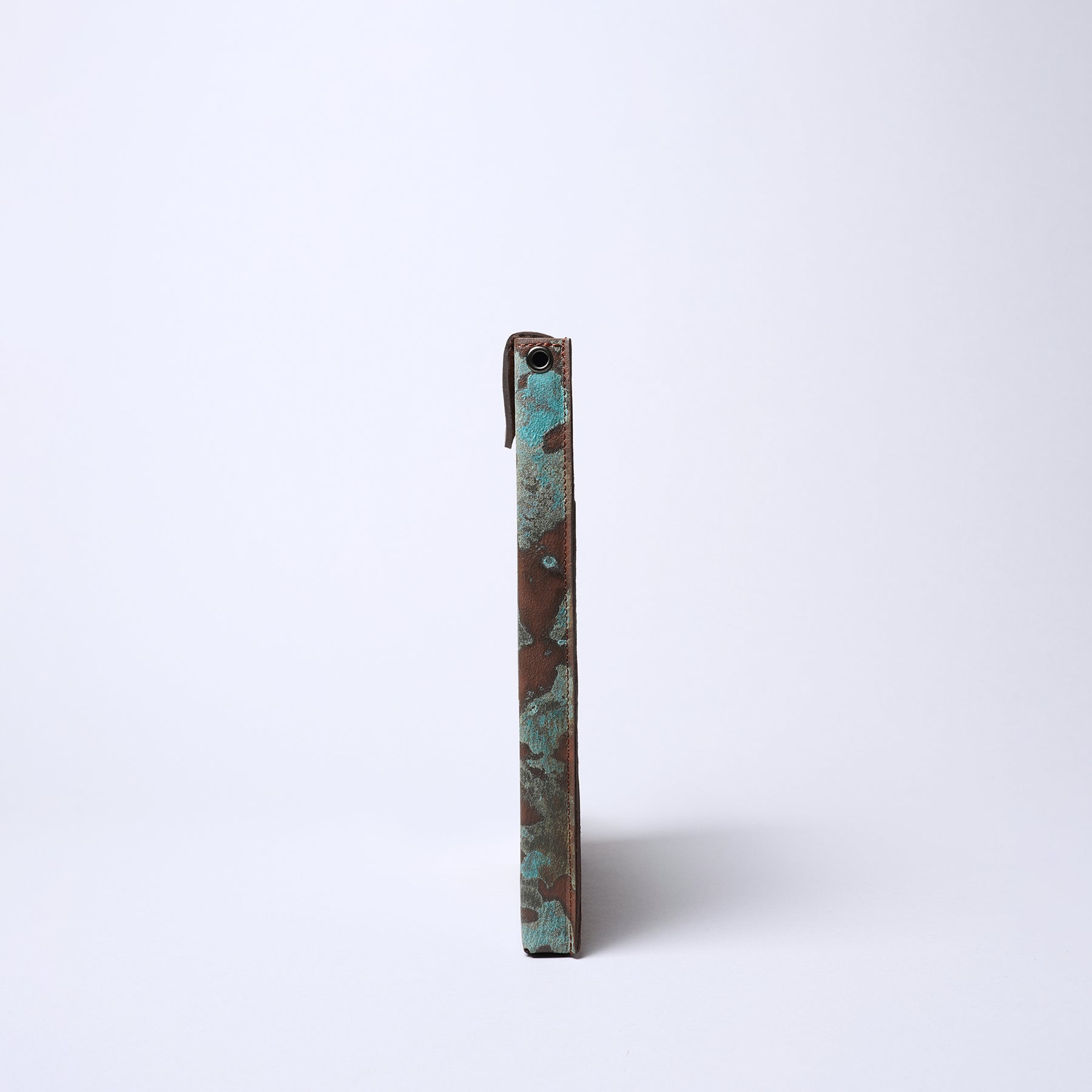 Genuine leather treated with brass and copper spray to induce a rustic patina