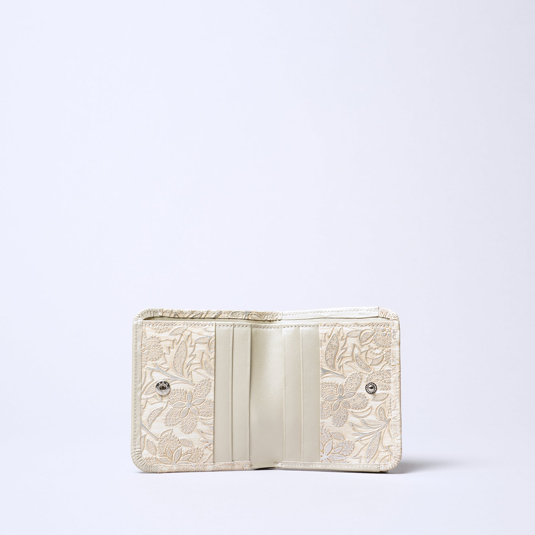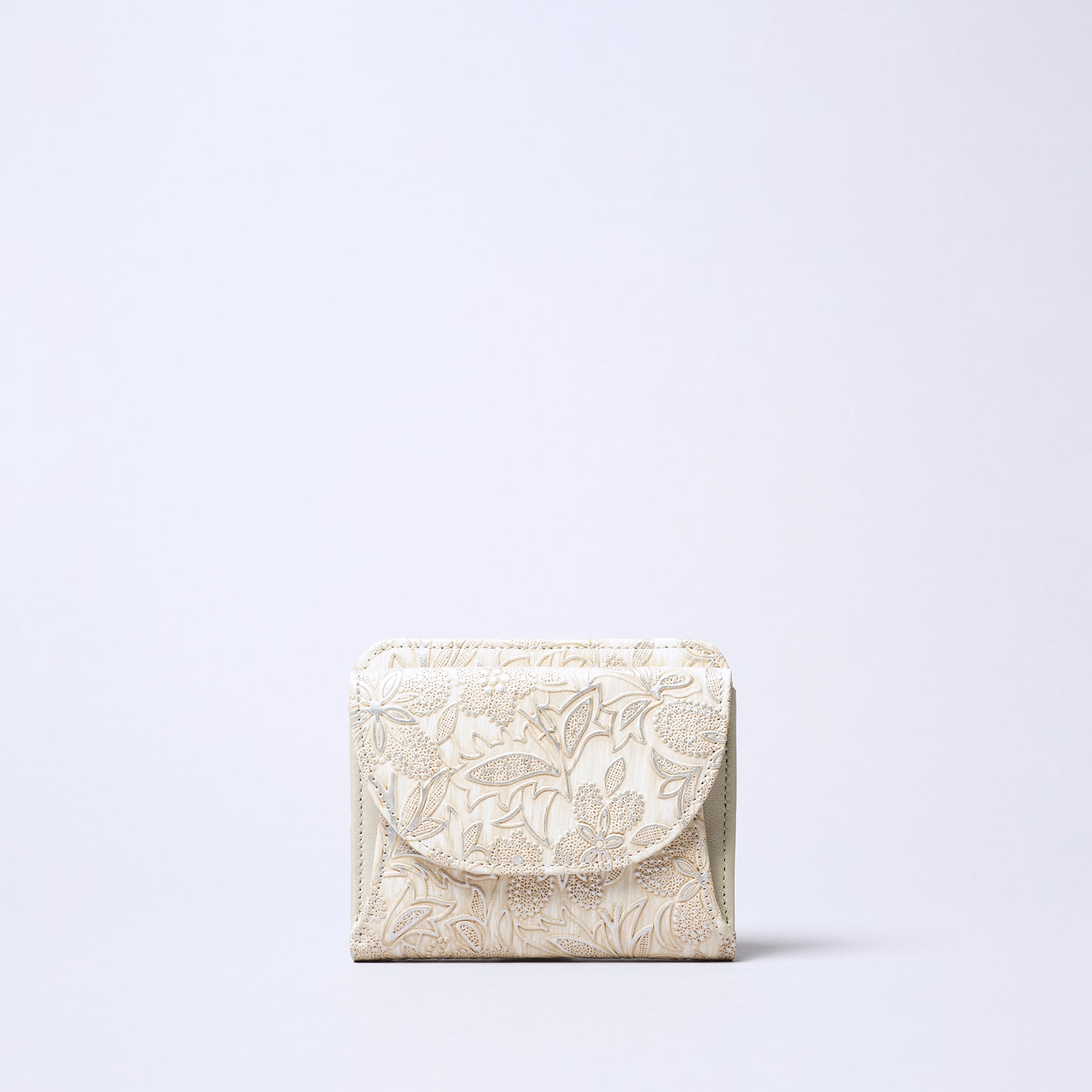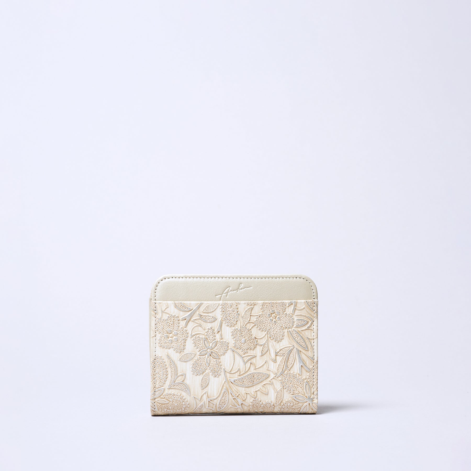 Made with delicate Italian embossed leather featuring a pearl finish. A feminine, elegant material. Crafted with care by Japanese artisans. Compact bifold wallet. The exterior coin pocket is box-style for easy visibility and access.