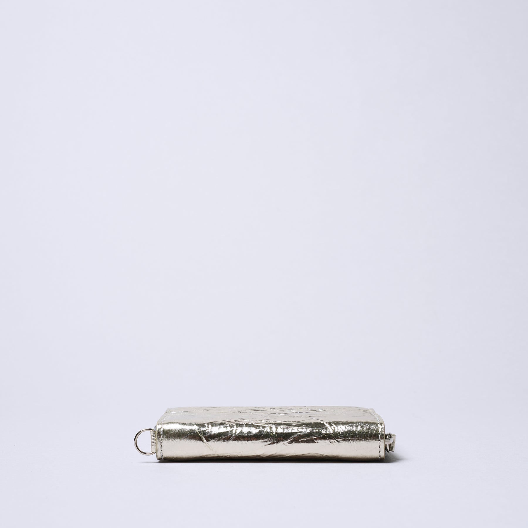 材質選用義大利製貼箔牛皮,金箔以隨機方式黏貼,刮痕不易明顯,呈現出獨特且富有個性的紋理。