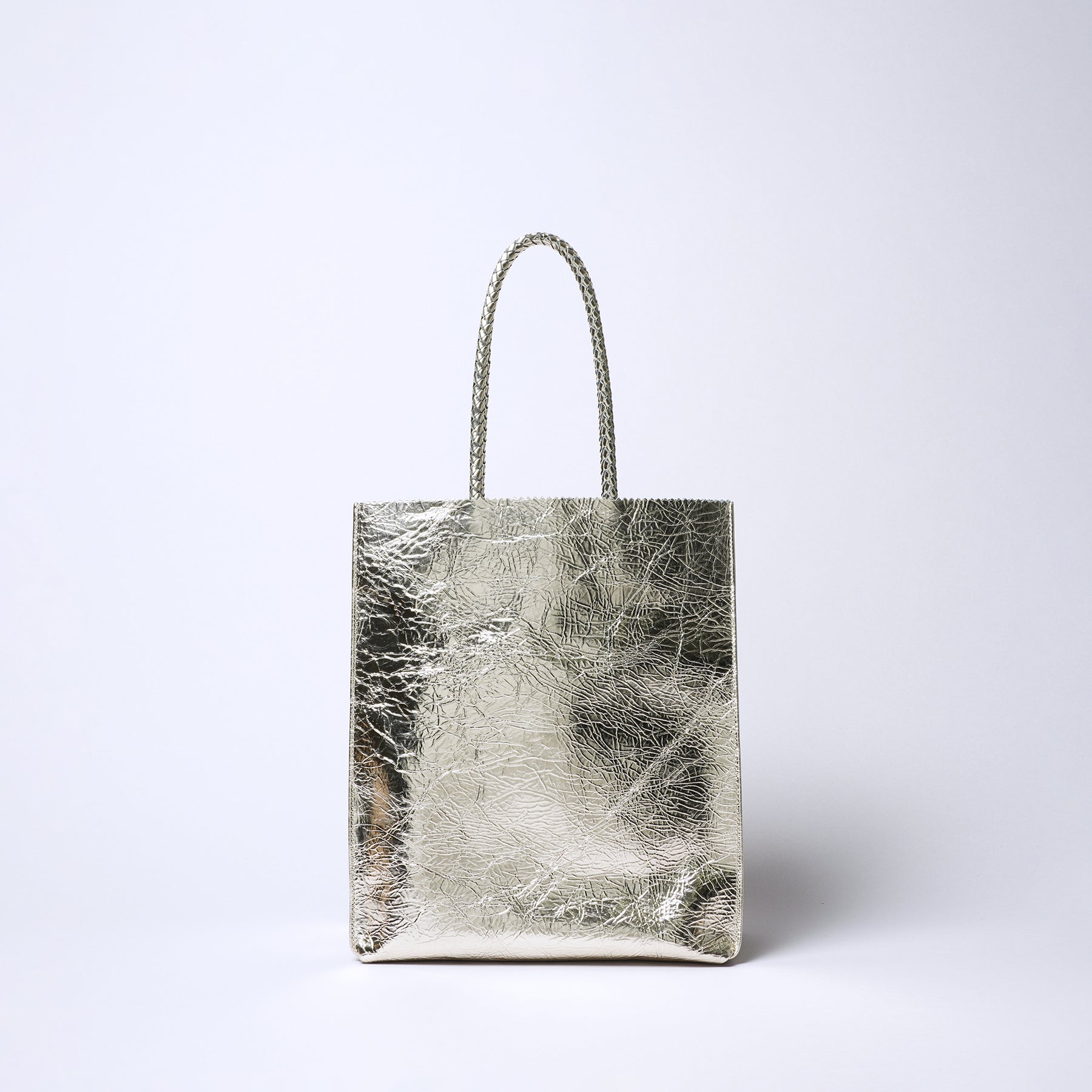 這款皮革托特包,選用皺褶箔面加工皮革製作而成。