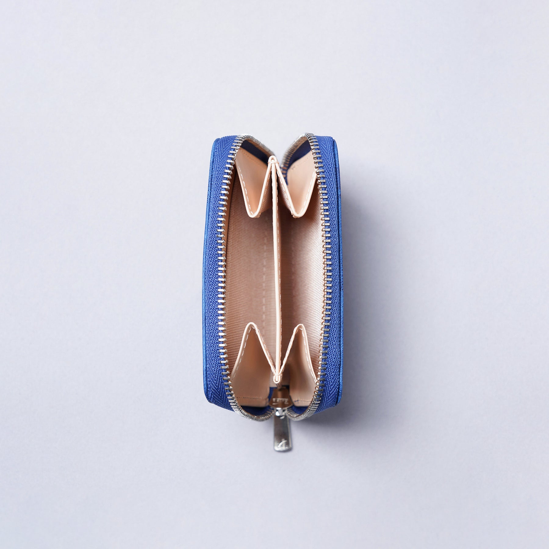 藍染是以蓼科植物「蓼藍」作為染料進行染色的一種工藝。這款商品所選用的柔軟羊皮,便是以手工花費大量時間染色而成,其染色工序為先進行手絞染後再浸泡於藍染桶中,之後再反覆操作三次,始能呈現出日本傳統高雅的藍染色「Japan Blue(日本藍)」。由於採用手絞染技法,每件作品的花紋與色澤皆獨一無二。這款方便攜帶的迷你錢包,適合收納卡片、零錢以及少量紙鈔。