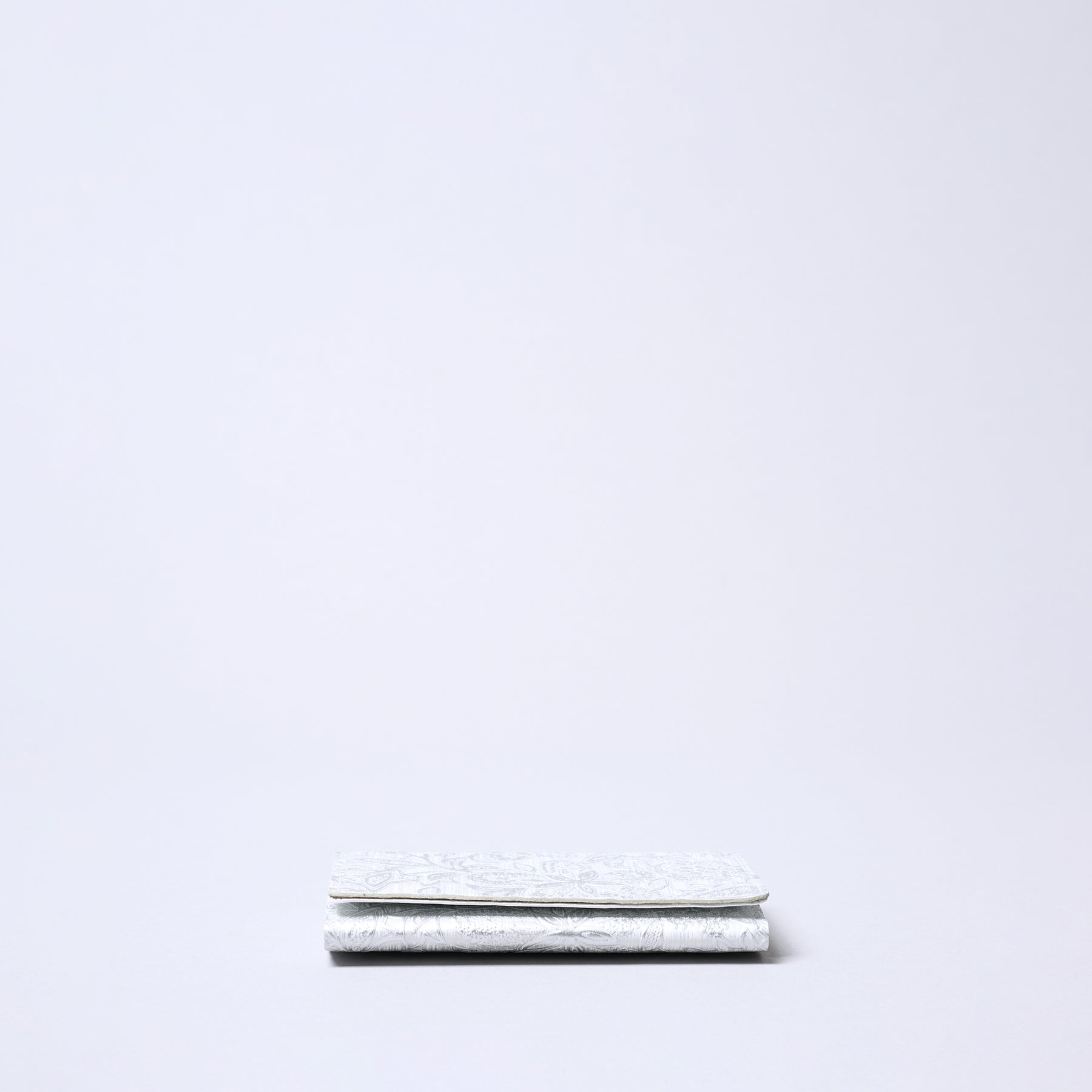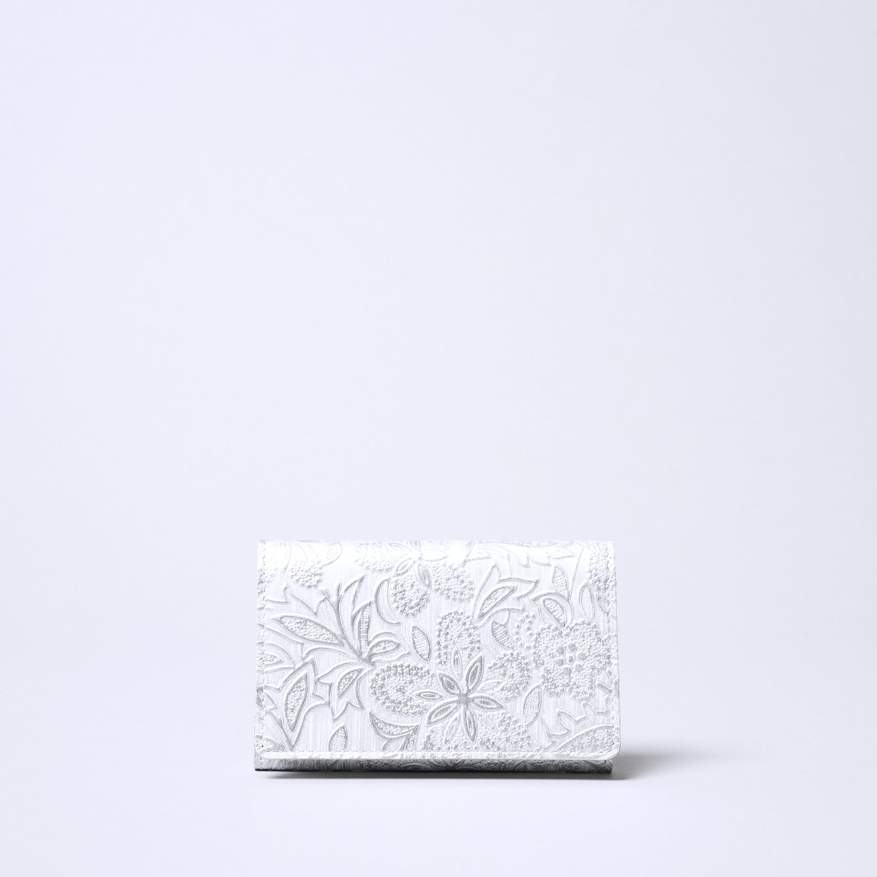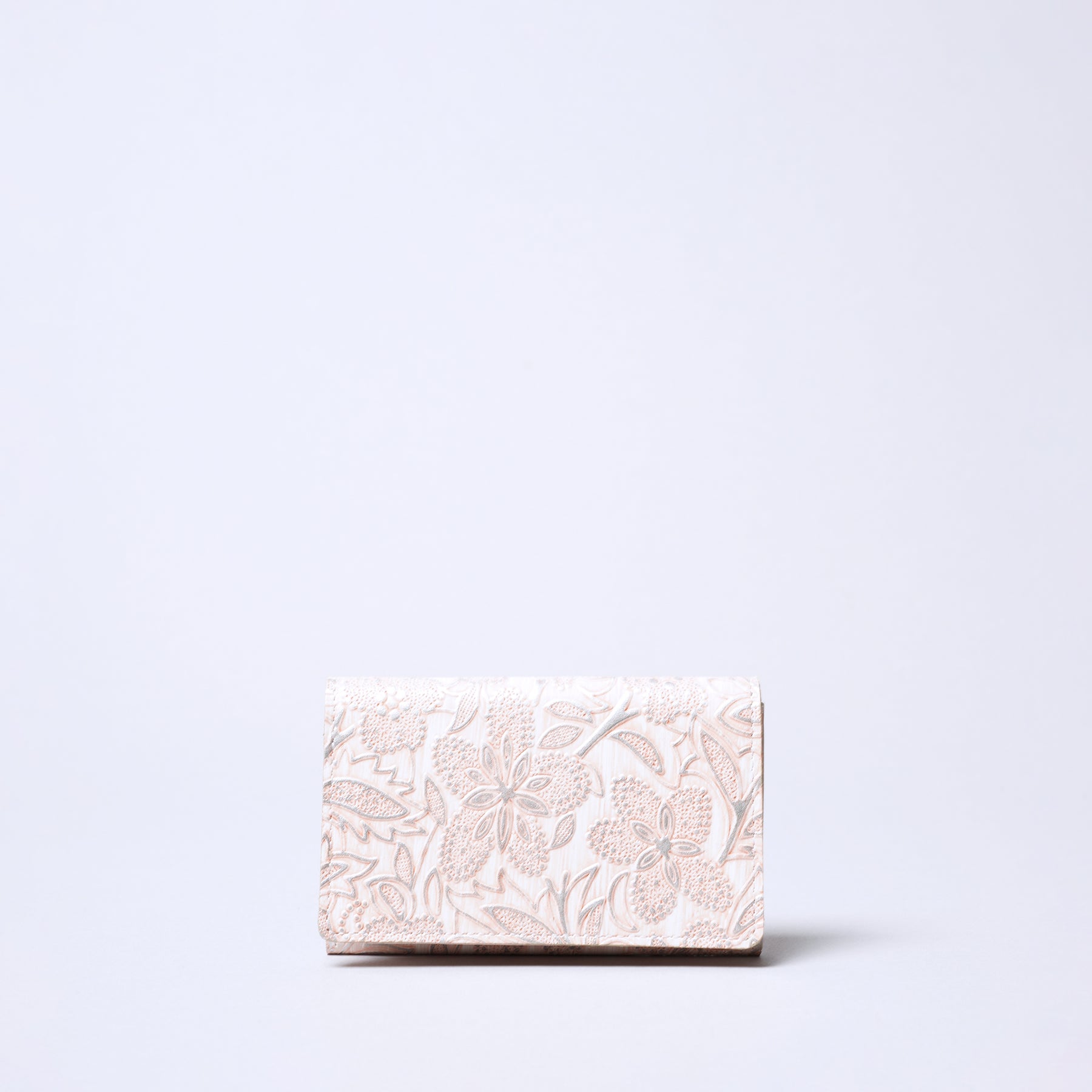這款名片夾採用以細緻珍珠光澤加工的義大利製壓花皮革製作而成,散發出女性柔美華麗的氛圍。由日本職人精心製作,內部為雙隔層結構。